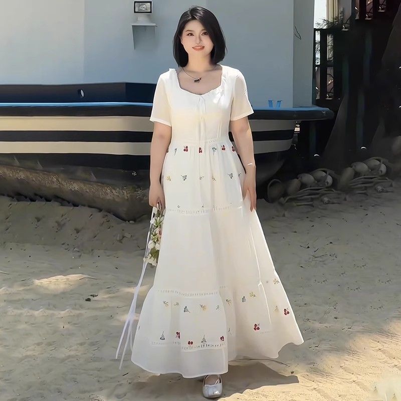プラスサイズの女性のファットmmホリデースタイルスクエアネック刺繍レース半袖ドレス2025夏スリム気質ロングスカート