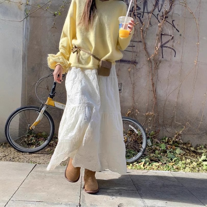 重工ジャカード刺繍ハイウエストA字ミディアムホワイト半身スカートレディース2025国風味傘スカートレディース