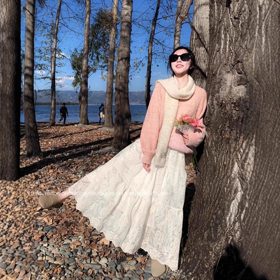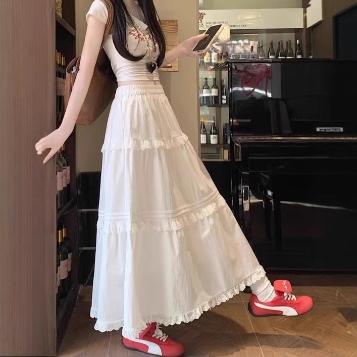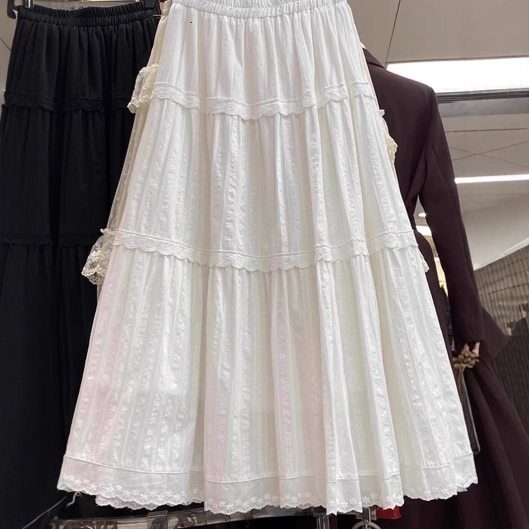 バレエ風白ケーキスカートレディース春新作レーススカート小柄ハイウエストAラインロングスカート