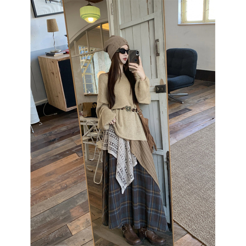 女性のための怠惰な雰囲気のスーツ春 2025 新しい模造モヘアニットセーターレトロチェック柄スプライシングスカート