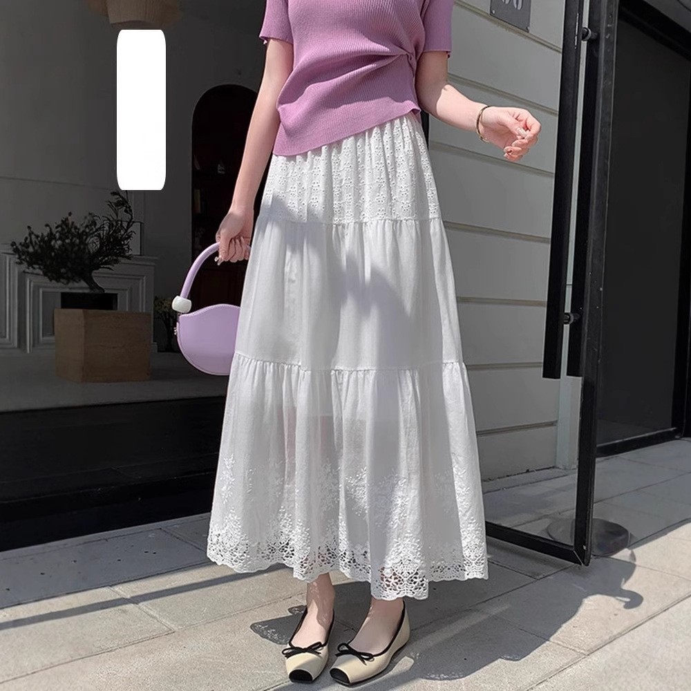 ケーキの層の刺繍のレースは半身のスカートの女性の2025早春の新型のフランスの小さい衆のA字の白い長いスカートをつなぎ合わせます。