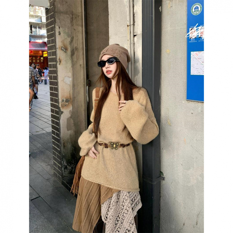 レトロなデザイン感の長袖の肩の不規則なニットのスーツの女性の春の怠惰な風の高い腰のスカートの2枚
