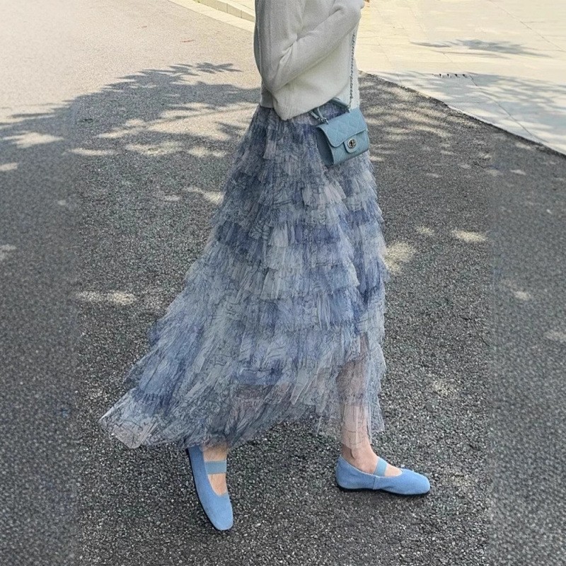 超仙レトロ染め層メッシュケーキ半身スカート2025夏高腰垂れ感a字大振り子ロングスカート女