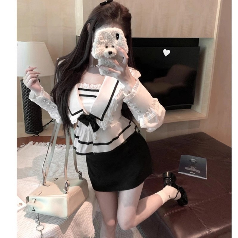 衝突色の新型は長袖jk制服ファッションスーツの女性の純粋な欲望の高級感のデザインをつなぎ合わせて腰の蓬蓬の半身のスカートを収めます。