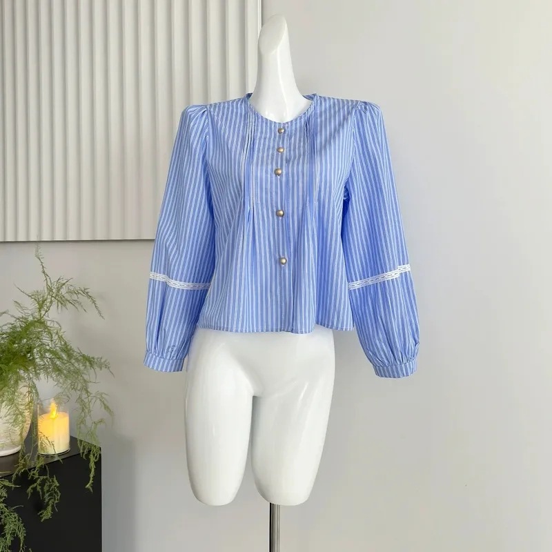 韓国系のデザイン感のある青いストライプの丸首の泡袖のシャツの女性の2024朝と秋のカジュアルな雰囲気の短い上着