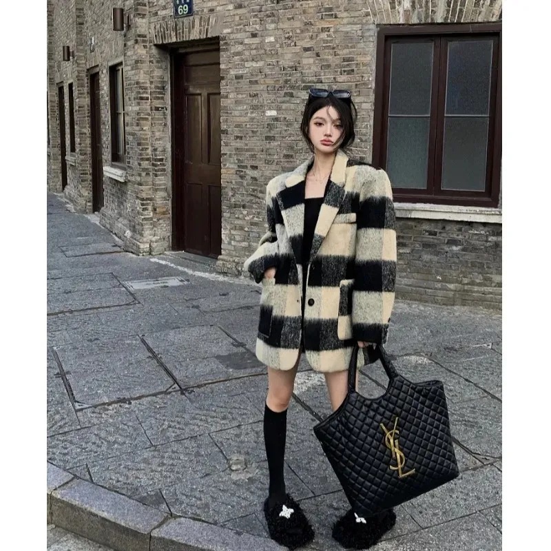 レトロなスーツの毛です。格子コートの女性は秋冬に高級感を増します。