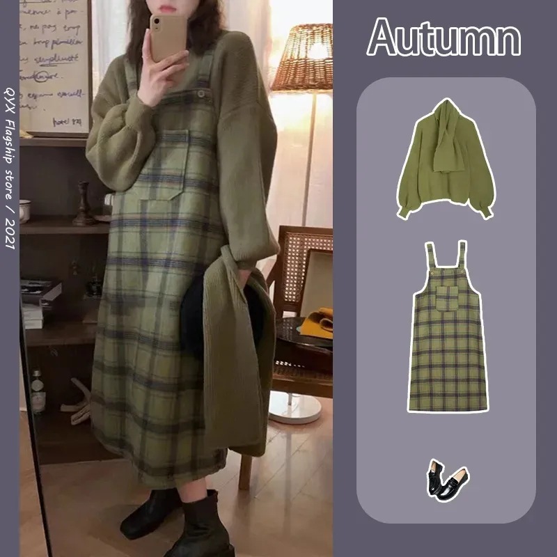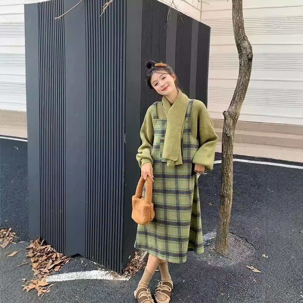 かわいい皮の年齢を減らすファッションスーツの女性の秋冬の色の緑色の格子の背もたれのスカートのセーターのマフラーの怠惰な風の2つのセット