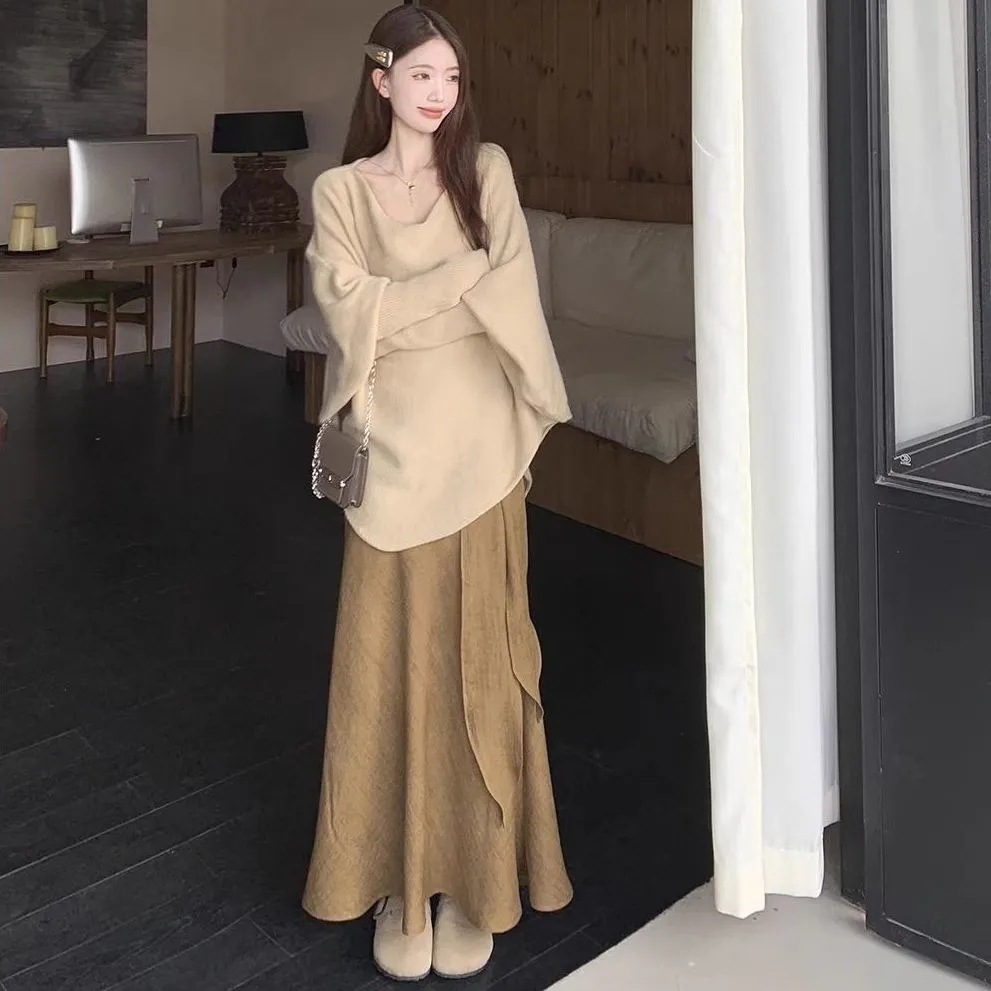 韓国ベルスリーブシャツレディースレイヤードノースリーブベスト2025早春痩身ハーフレングススカート3点セット
