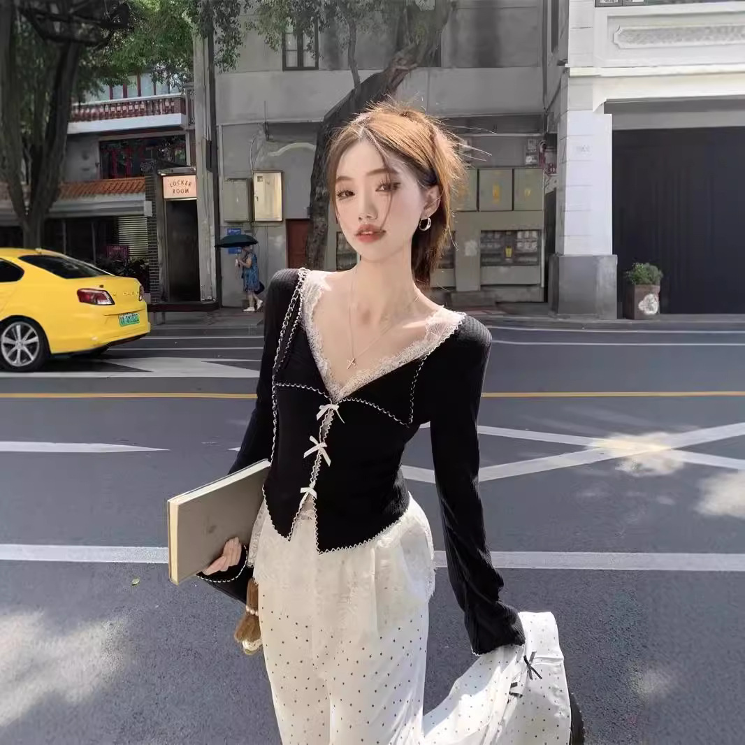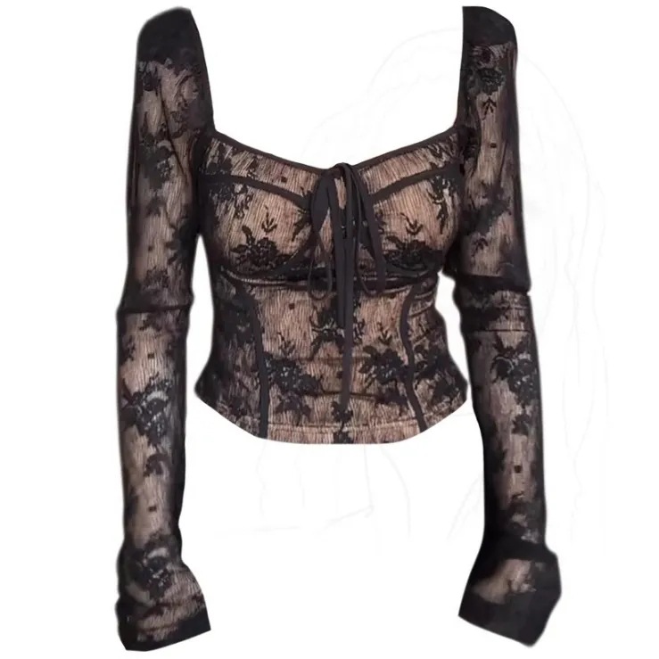 フランスのレトロな純欲風の黒いレースの長袖のtシャツの女性の早秋の新型の修身はやせていて美しいです。