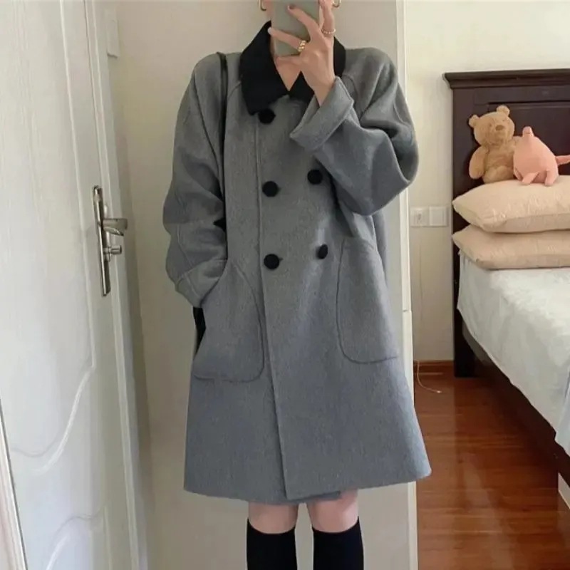 減齢の子供の襟の長袖の毛はコートの女性の秋冬のフランスの気質の双列のボタンの中の長いタイプのゆったりしているラシャのコートです。