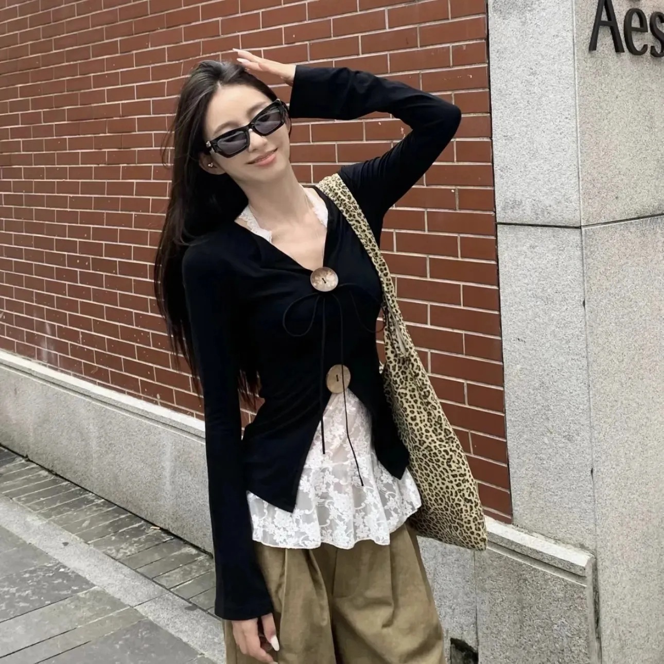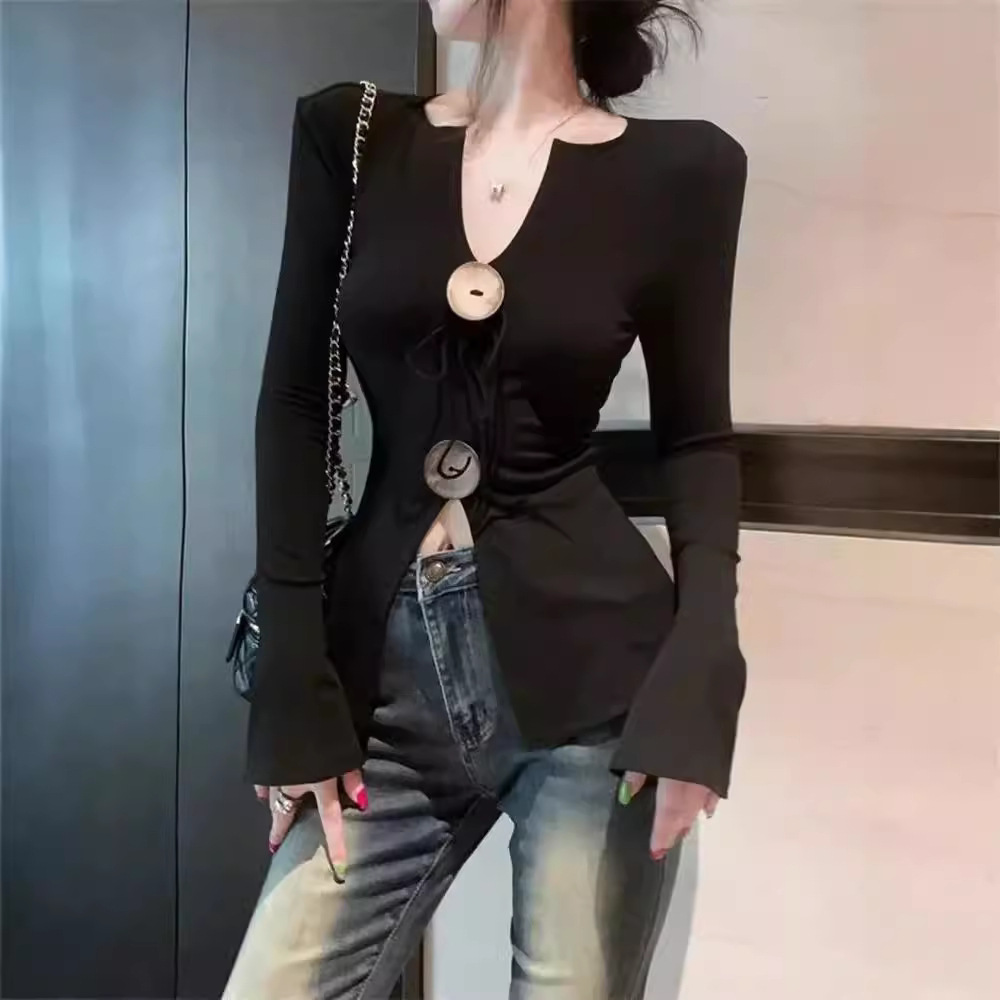 不規則なオープンボタン長袖tシャツ女性秋御姐ギャルvネック上着のデザイン感があります。