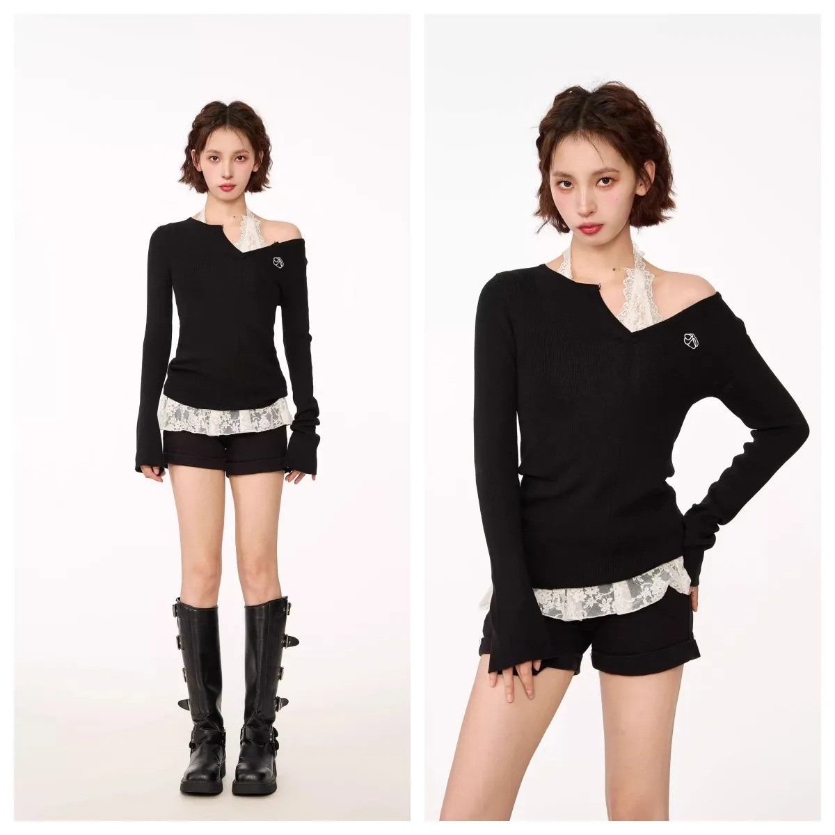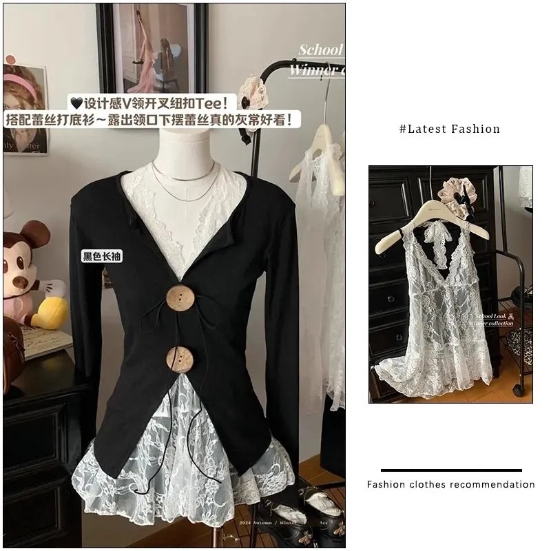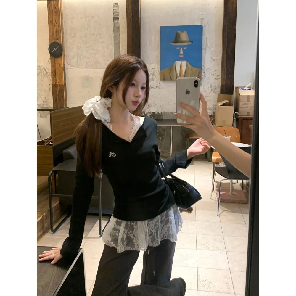 ギャルの黒いvネックの刺繍のニットのセーターの女性の2024秋の白いレースの首のベストの2つのセット