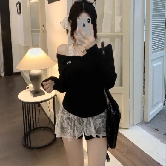 黒い肩のニットの底のシャツの女性の秋のレースの中にデザイン感のセーターのギャルの肩の短い上着を掛けます。