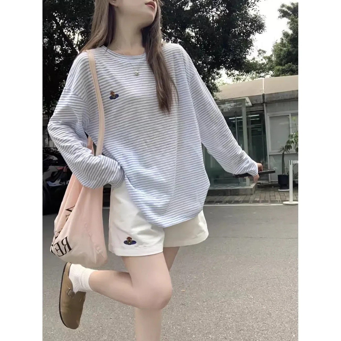 清雅なごキャラの経典の百合のストライプの長袖のtシャツの女性の2024夏の薄いタイプの日焼け止めのブラウスのゆったりしている上着