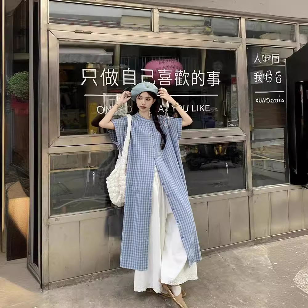 格子縞の長いデザイン感リゾート風半袖シャツ女性の夏の新しいゆるいカジュアルなズボンのファッションスーツのファッション