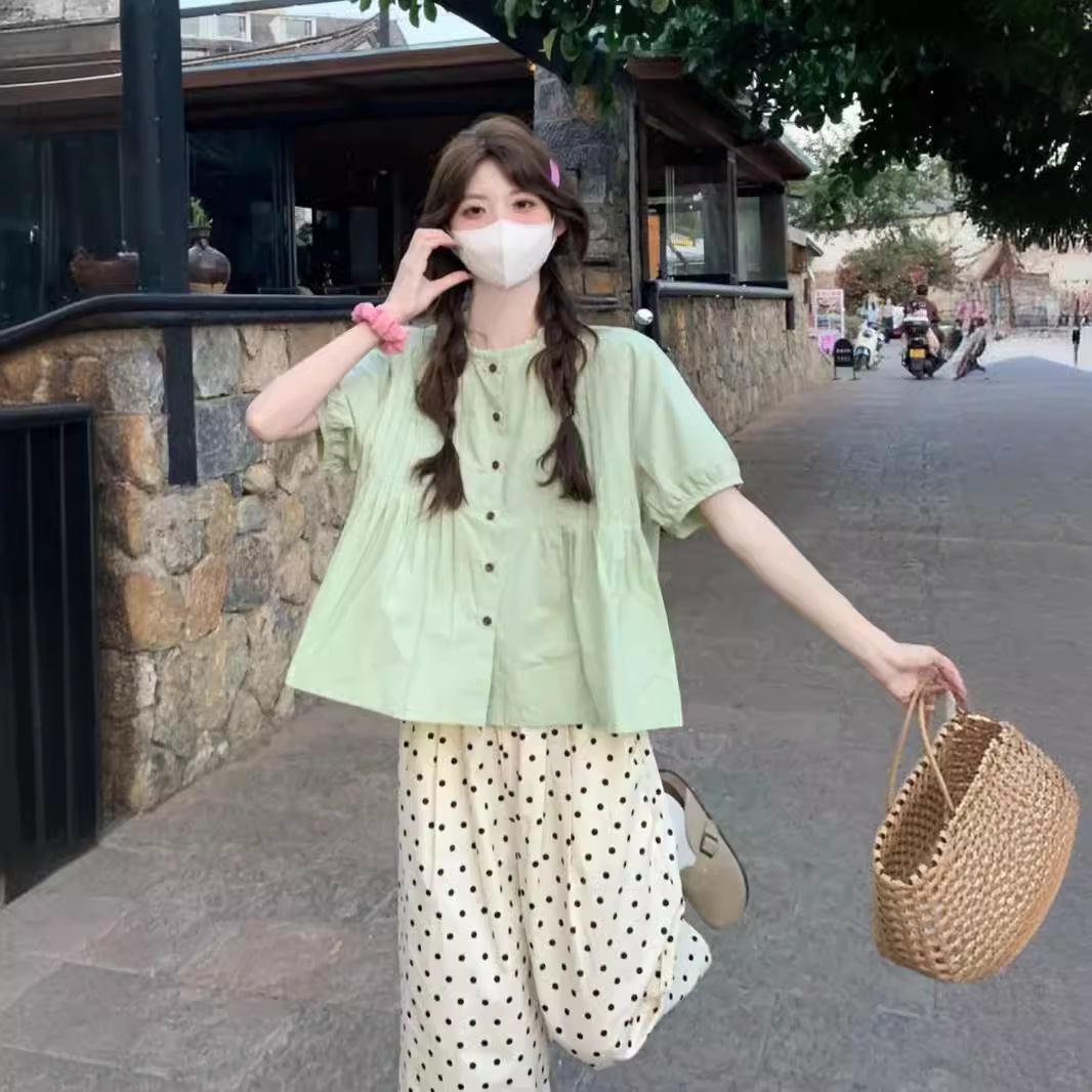 小柄な短い丸首の泡袖シャツ女性夏の半袖シャツの子供服の上着2024年の新型