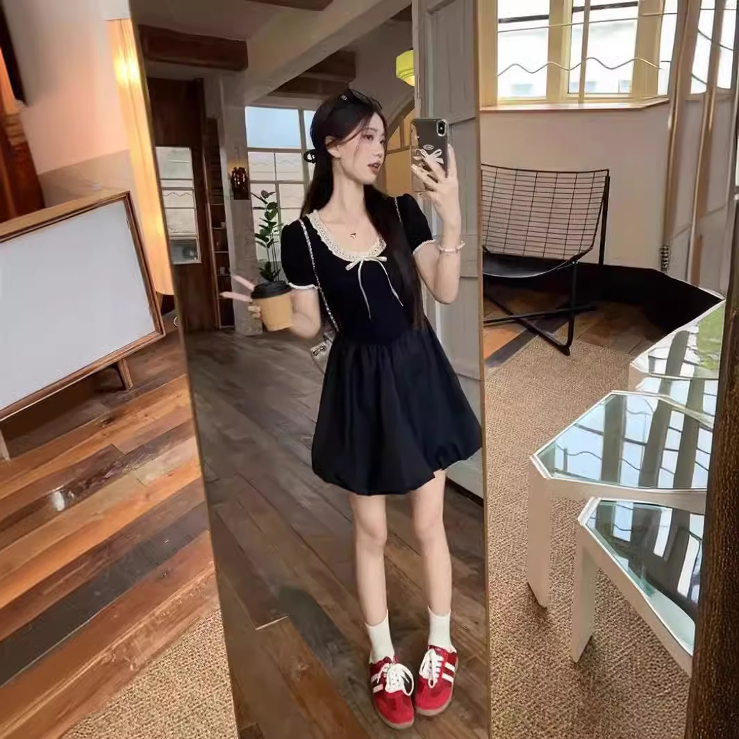フランス式の黒いレースの泡の袖のワンピースの女性の夏は腰のa字のスカートの気質の高級感の蓬蓬のショートスカートを収めます。