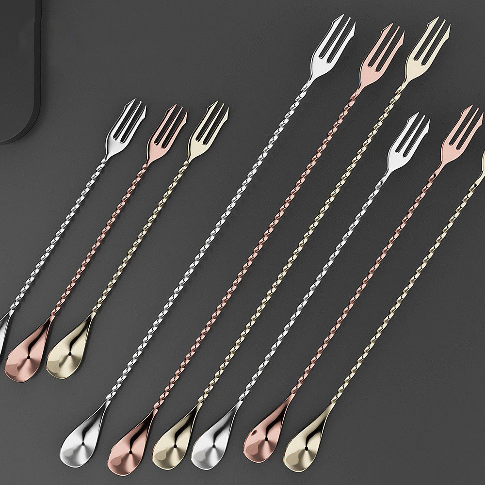 304ステンレス製バーテンダースプーン 長柄ミキシングスティック クリエイティブカクテル両頭バースプーン フォークバースプーン