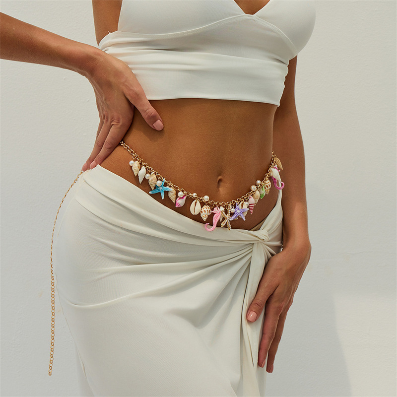 涼しい夏のビーチリゾートスタイルの真珠、ヒトデ、貝殻、巻貝、樹脂、タツノオトシゴのウエストチェーン、カラフルなドーパミン
