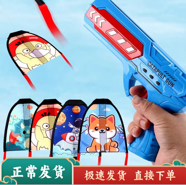 凧銃を発射する子供のアウトドアスポーツは、凧の泡を持って滑る飛行機の発射機の春のキャンプのおもちゃを持っています。