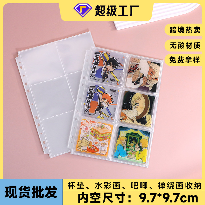 A4型六六宮格カードの幅が広い宝麗来は内ページのコースターをたたいてバインダーの代わりに芯カードの袋の現物を収納します。