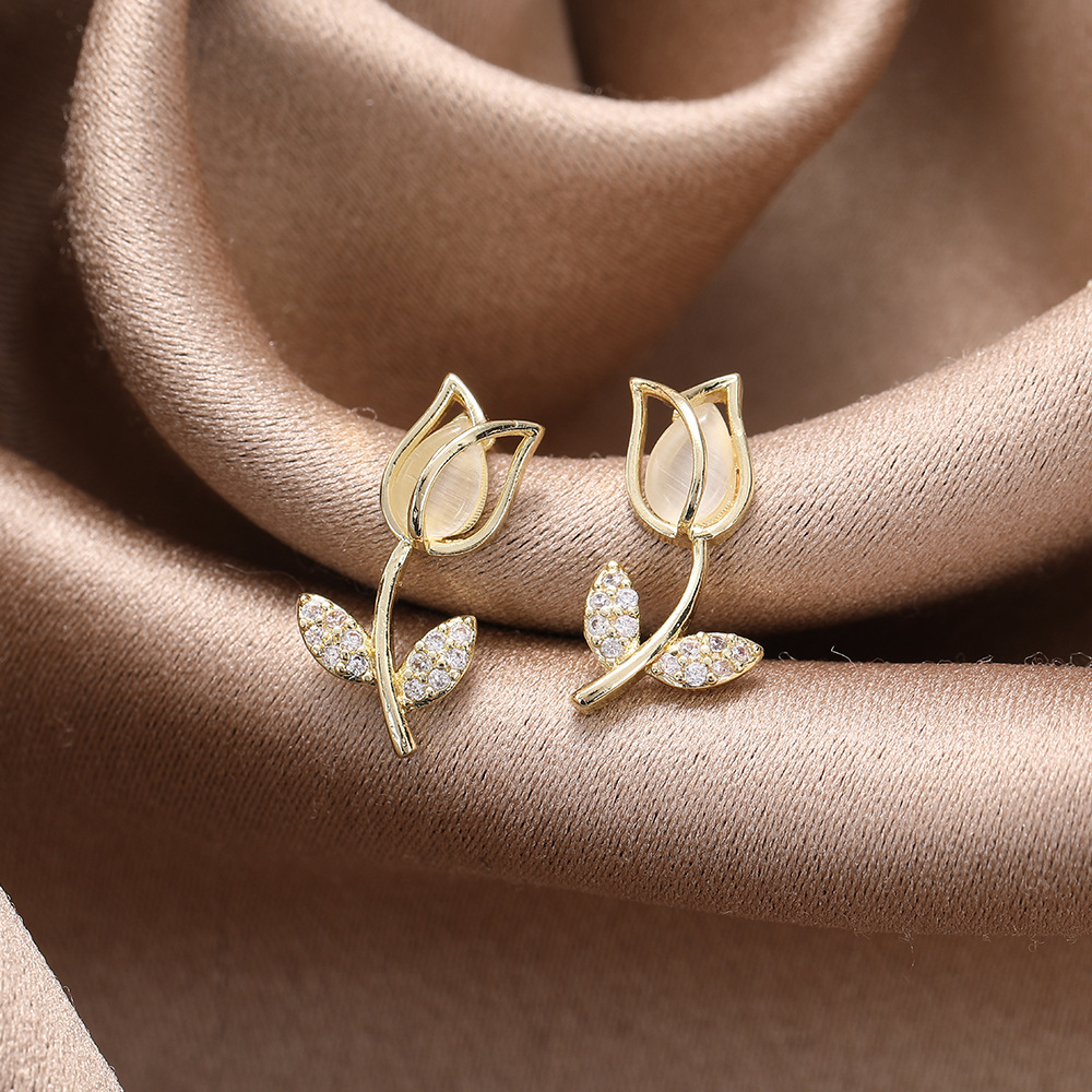 チューリップはジルコンの猫の目の石のイヤリングの女性のシンプルな気質の個性のピアスを入れて2025年に新型の耳飾りのファッションを飾ります。