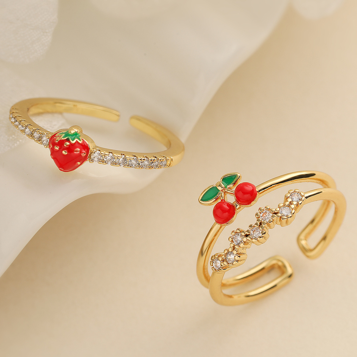 韓国版の新鮮でキュートで遊び心のある女性用の赤いイチゴリング、シンプルなジルコンがちりばめられたオープン人差し指関節リング