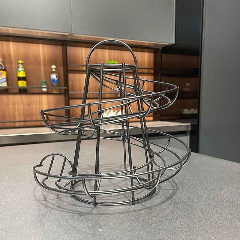 台所の螺旋式の卵の棚の台所の家庭の卵のかごの黒色の金属の鉄の卵の棚はハンドルの螺旋の設計を持ちます。