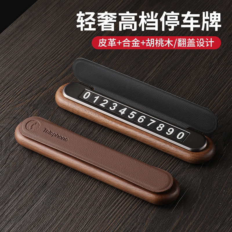 黒胡桃木質移動ナンバープレート電話番号札自動車用品隠し式創意皮質臨時駐車ナンバープレート