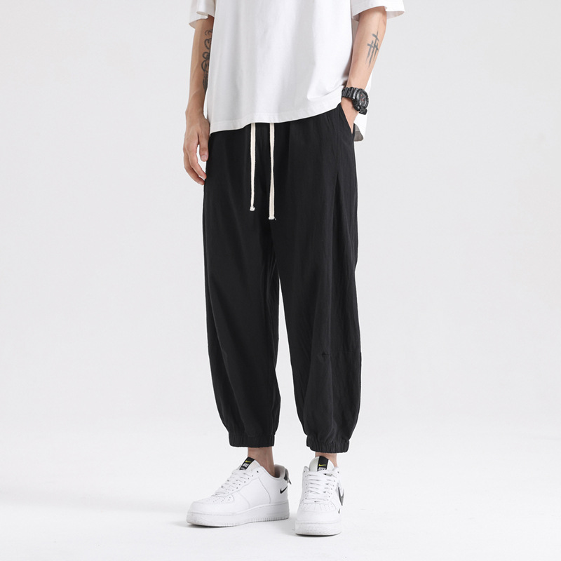日本式黒綿麻八分ズボン男夏の薄いタイプのデブと太ったサイズの足がゆったりしています。