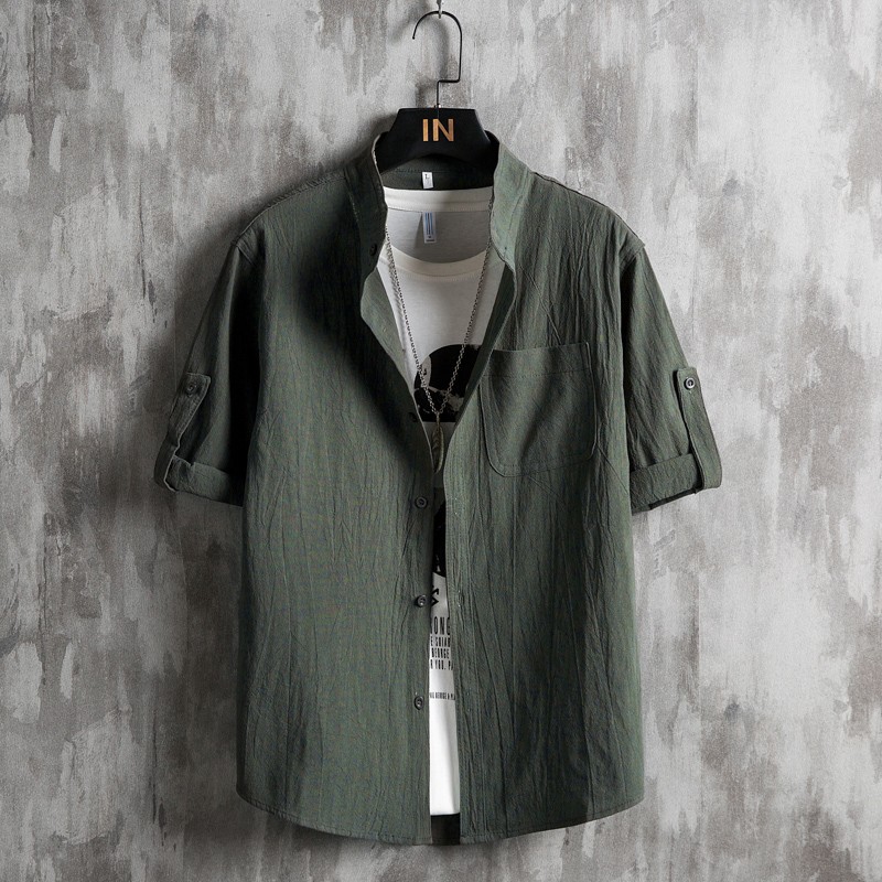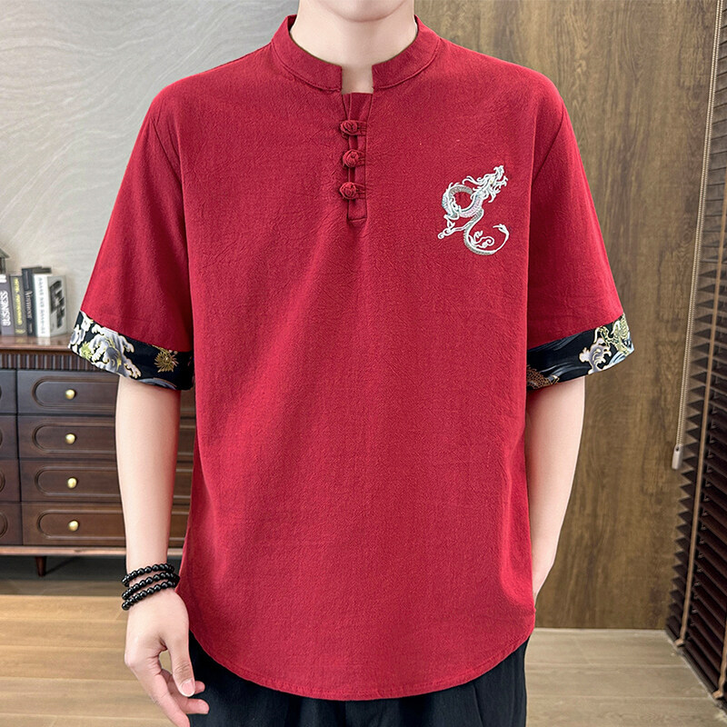 中国風綿麻男シャツ復古風唐装漢服七分袖立襟中山tシャツ半袖麻男上着