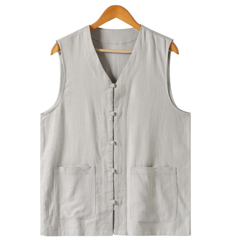 夏の薄手の亜綿麻の中国式のベストの唐装の馬甲は復古の古い北京の漢のシャツの馬の上着の中高年の紳士服を掛けます。
