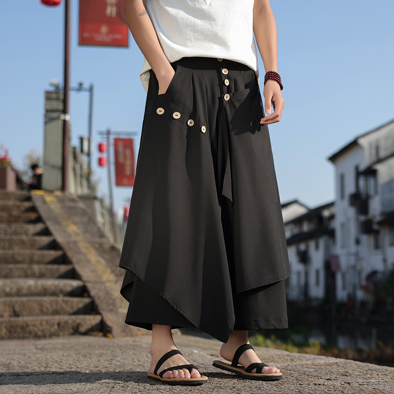 中国風のスプライシング二層ワイドレッグキュロットメンズルーズドレープフロアモップパンツニッチデザイン中国剣道パンツ