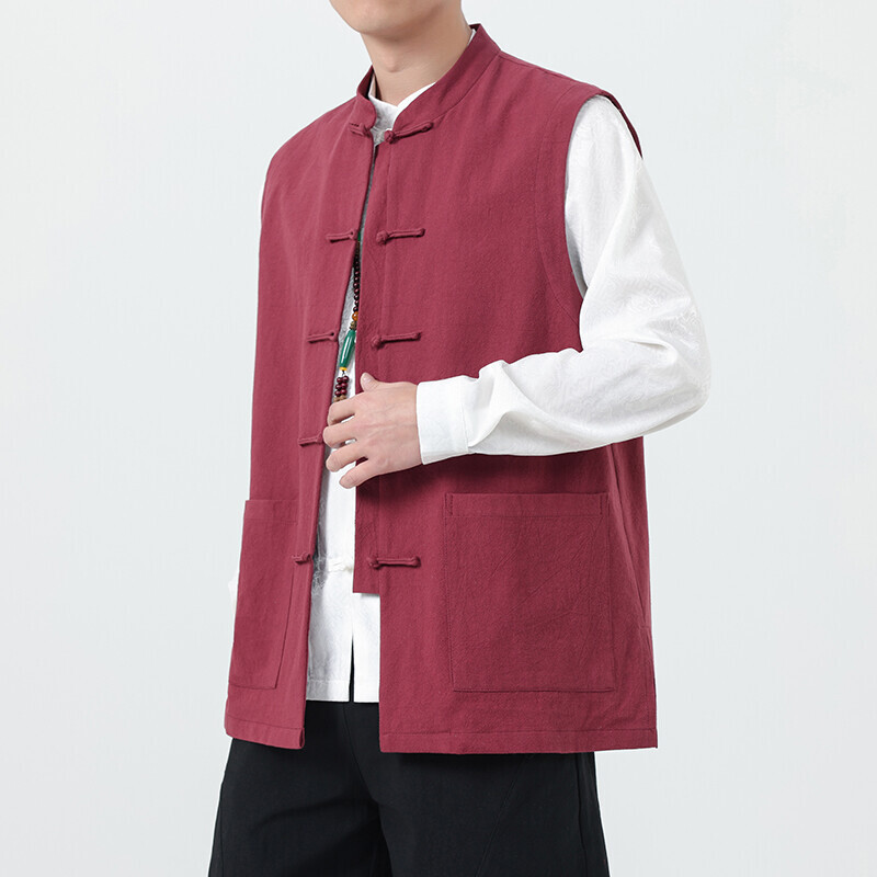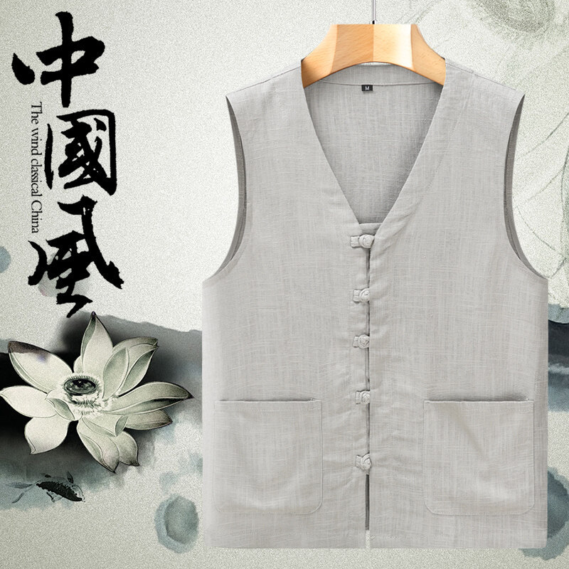 中国風レトロ綿麻馬甲男新中国式盤バックルカン肩亜麻茶禅服青年春夏唐装漢服
