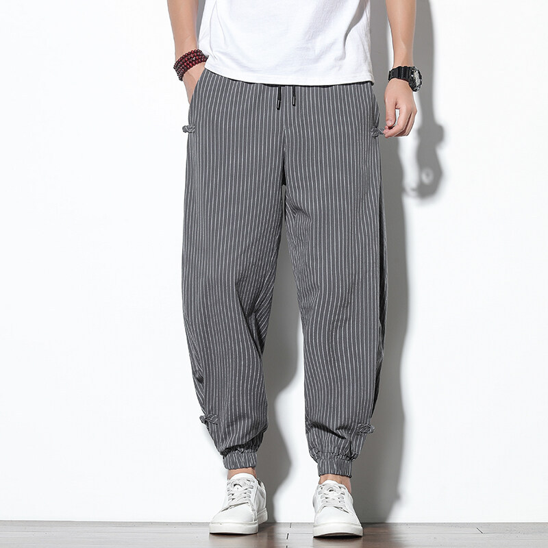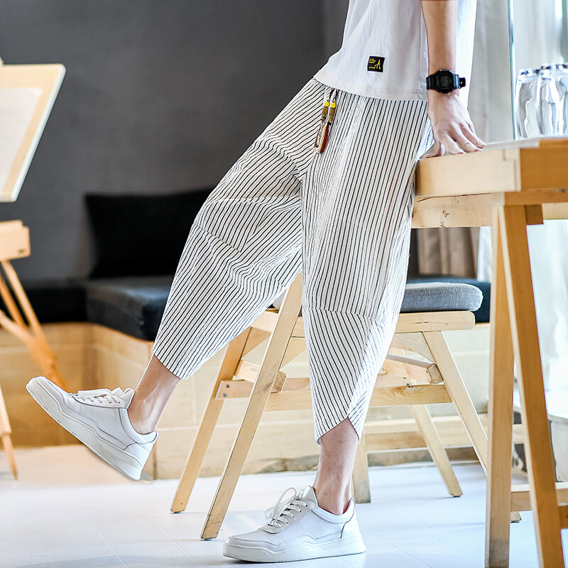 綿麻のカジュアルなズボンの男性の亜麻のストライプの7分のズボンの夏の薄いタイプのゆったりしている7分のズボンの中国風の大きいサイズのショートパンツ