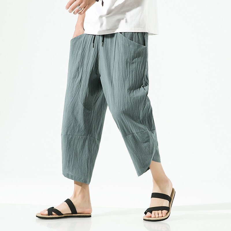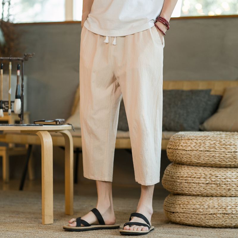 亜麻のズボンの男性の半ズボンの7分のズボンの夏の薄いタイプの綿の中のズボンのカジュアルなスポーツのズボンのストレートのゆったりしている7分のズボン