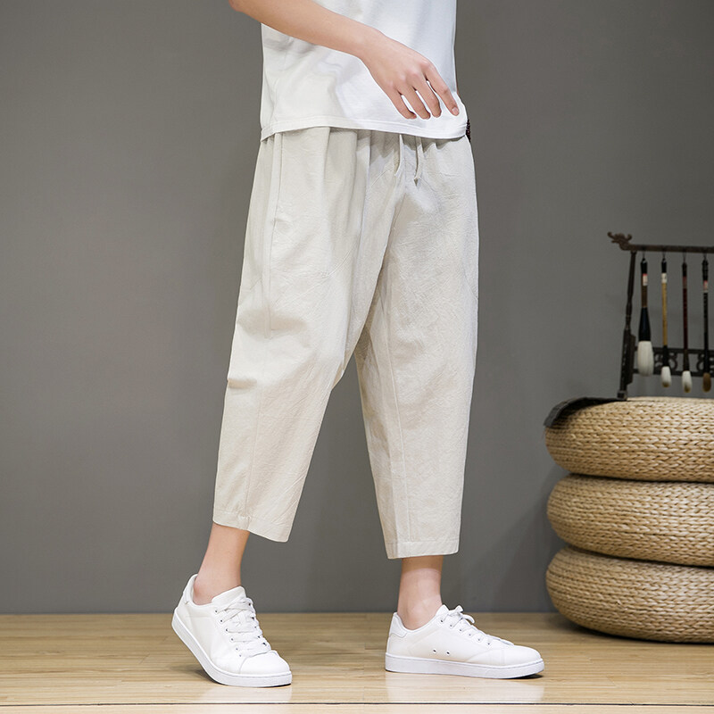 亜麻の9分のズボンの男性の夏の薄いテーパードカジュアルのズボンの潮流はゆったりとしていて、腰の純色の百合のハーレムのズボンを締めます。