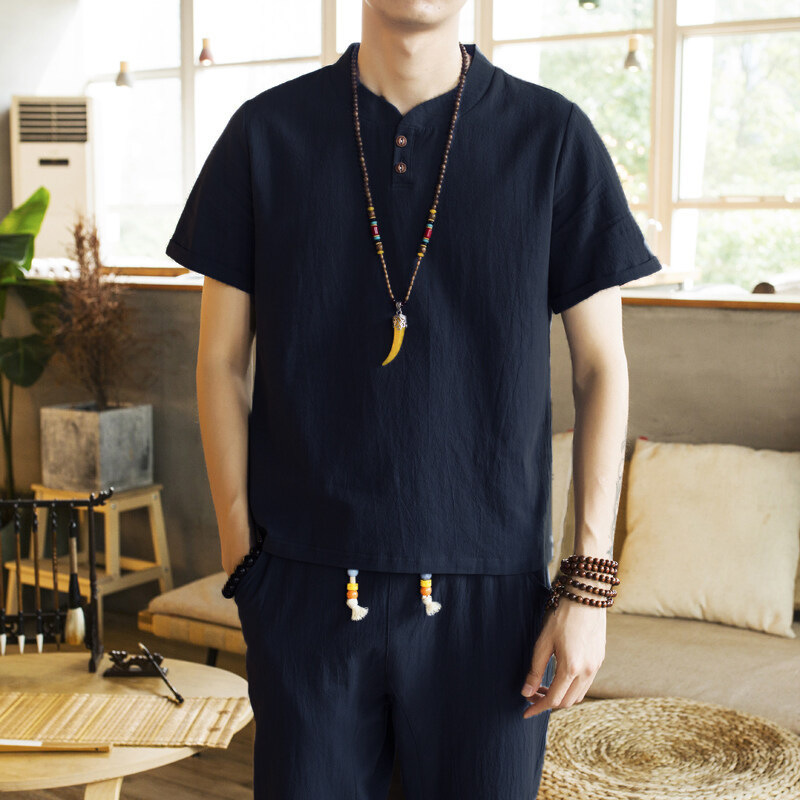 中国風綿麻半袖tシャツセット男性亜麻半袖中袖上着夏ファッション服