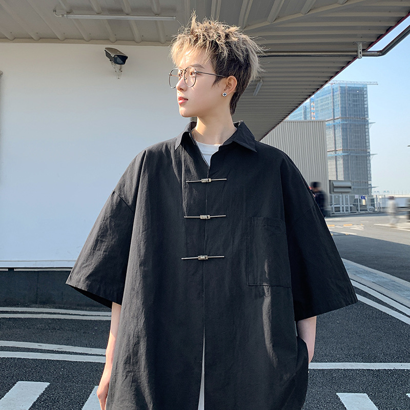 半袖シャツ男性2025夏の新型国風カップルのゆったりした大きいサイズの純色カジュアルシャツのコート