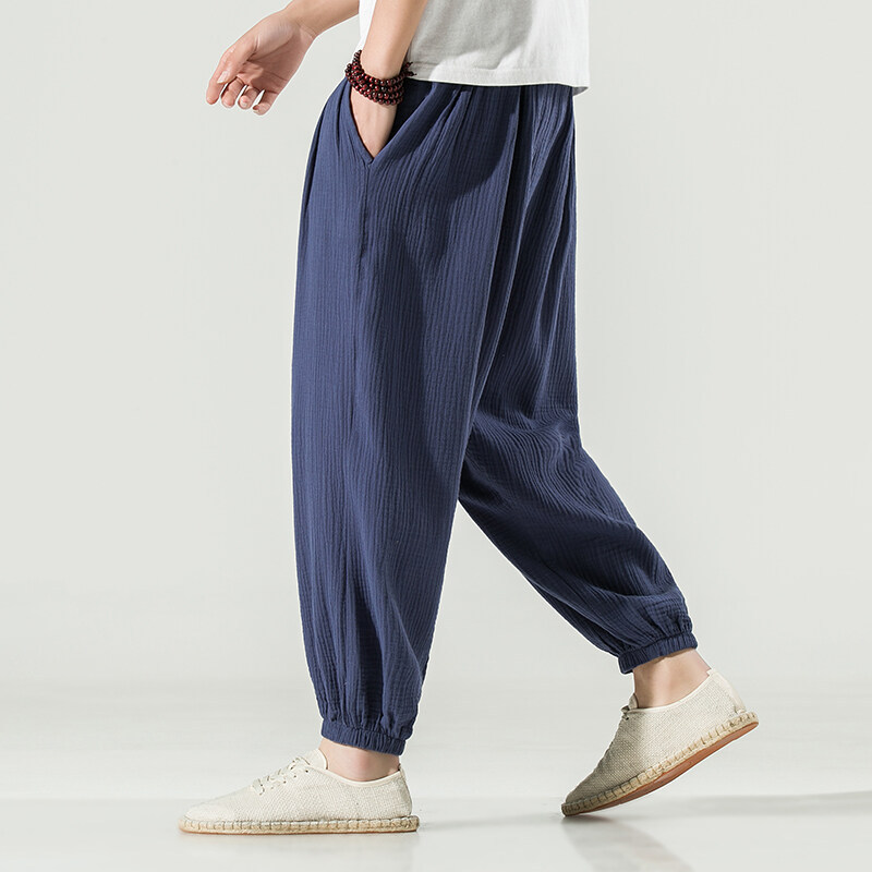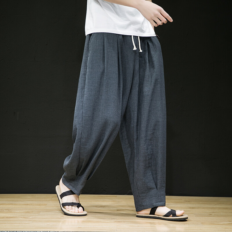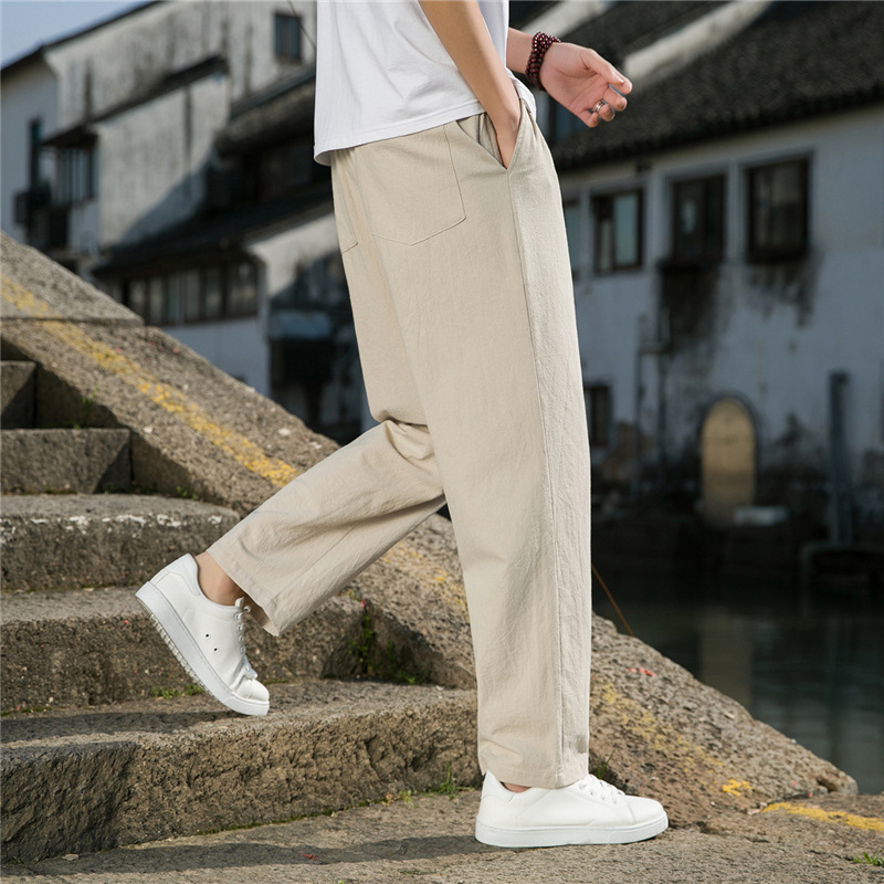 春と秋の中国風亜麻のズボンの男性のズボンはゆったりしています。