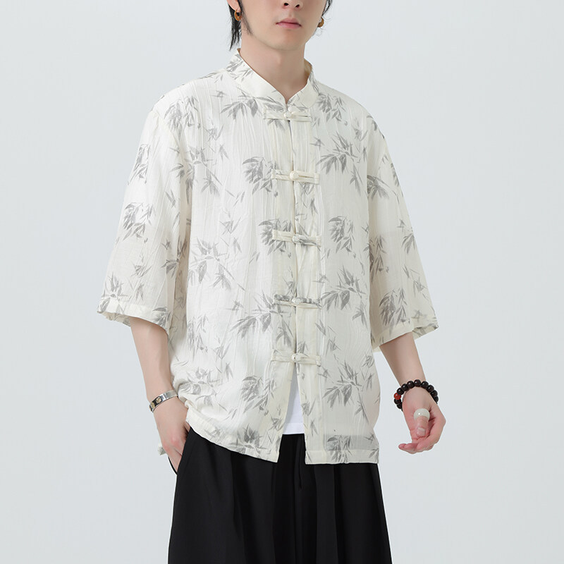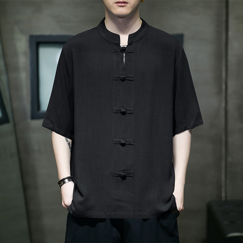 夏のビッグサイズ中国風盤ボタン半袖シャツ男性中国式唐装古着古風漢服復古中山服