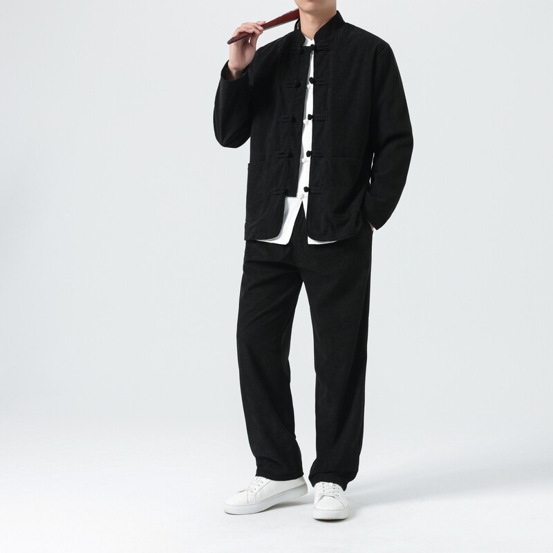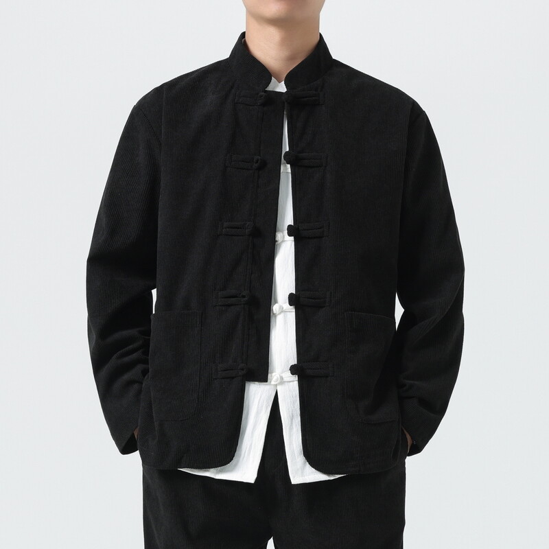 新中国風コーデュロイ長袖シャツ男性中国風盤ボタン立襟唐装中山装春秋シャツコート