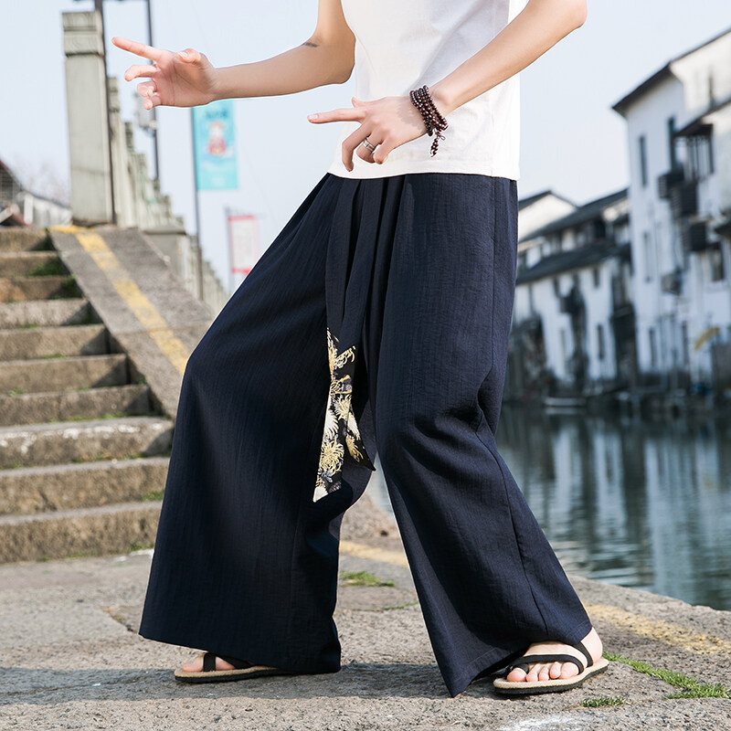 中国風メンズゆるい亜麻パンツ刺繍古風刺繍唐装漢服ハーレムズボン綿麻束脚灯籠ズボン