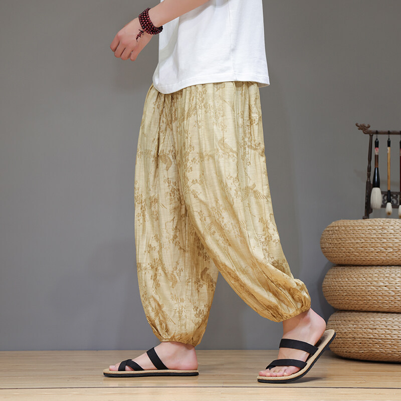中国風の男性の夏の薄いタイプの9分のズボンのゆったりした紳士服の足首のズボンの灯籠のズボンの綿の麻の広い足のカジュアルなスポーツのズボン