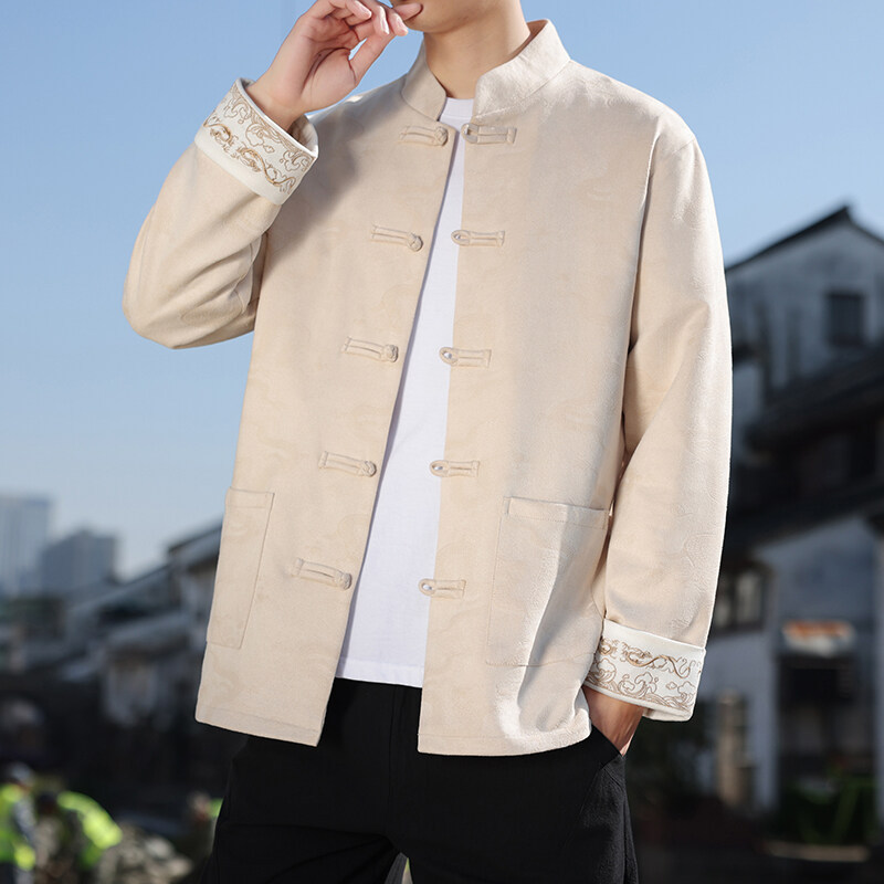 中国風メンズ鹿革パイルジャケット龍紋ゆるい春秋コート復古盤ボタン唐装大サイズ中山装潮