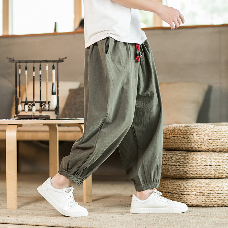 綿麻の広脚のズボンの男の夏の薄い金の束の足のハーレムのズボンの中国風の太った人のゆったりしている大きいサイズの9分の灯籠のズボン
