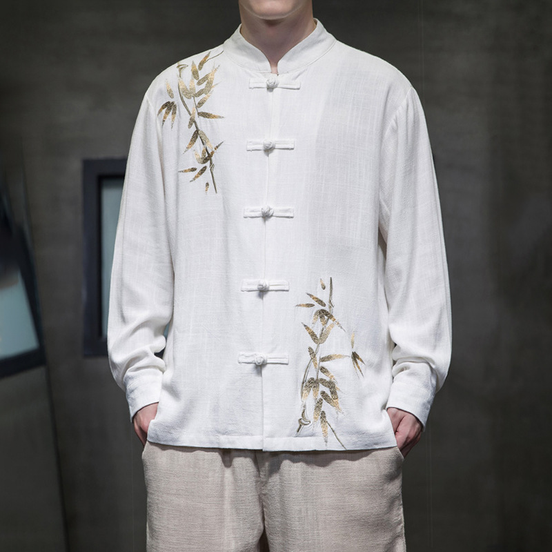 中国風メンズ秋長袖亜麻シャツ新中国式唐装漢服男性大サイズ古風刺繍茶禅服