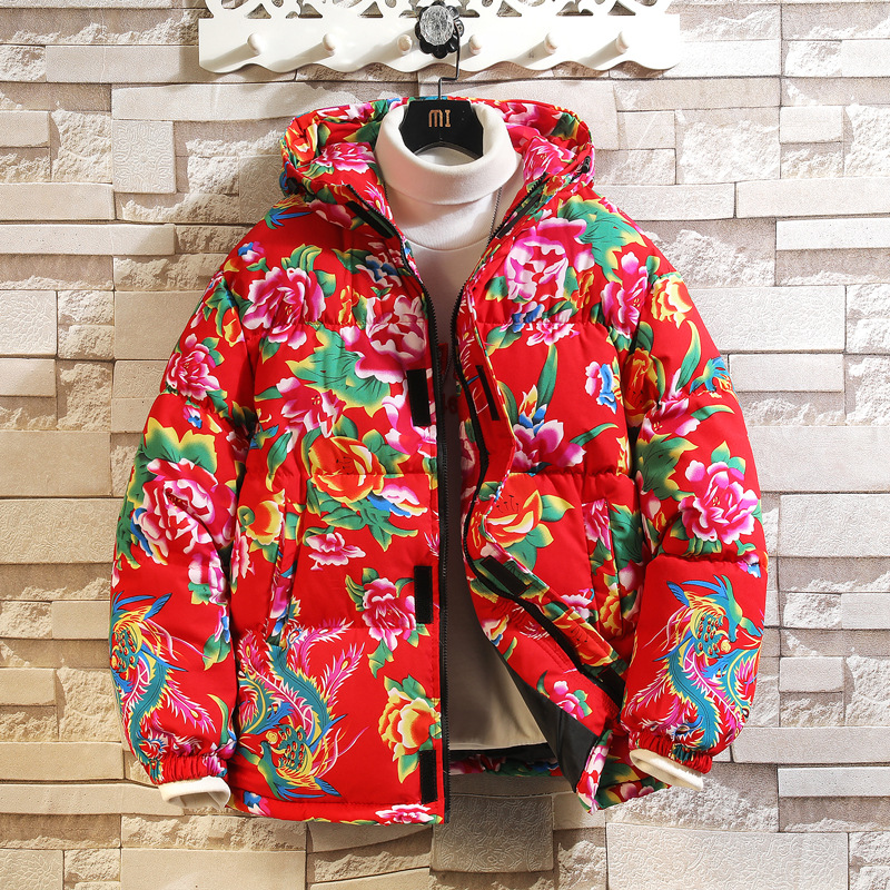 国潮東北大花中国綿入れの男女のボタンの花の冬の綿入れの服のネットの赤い色の厚い保温の綿服のコート