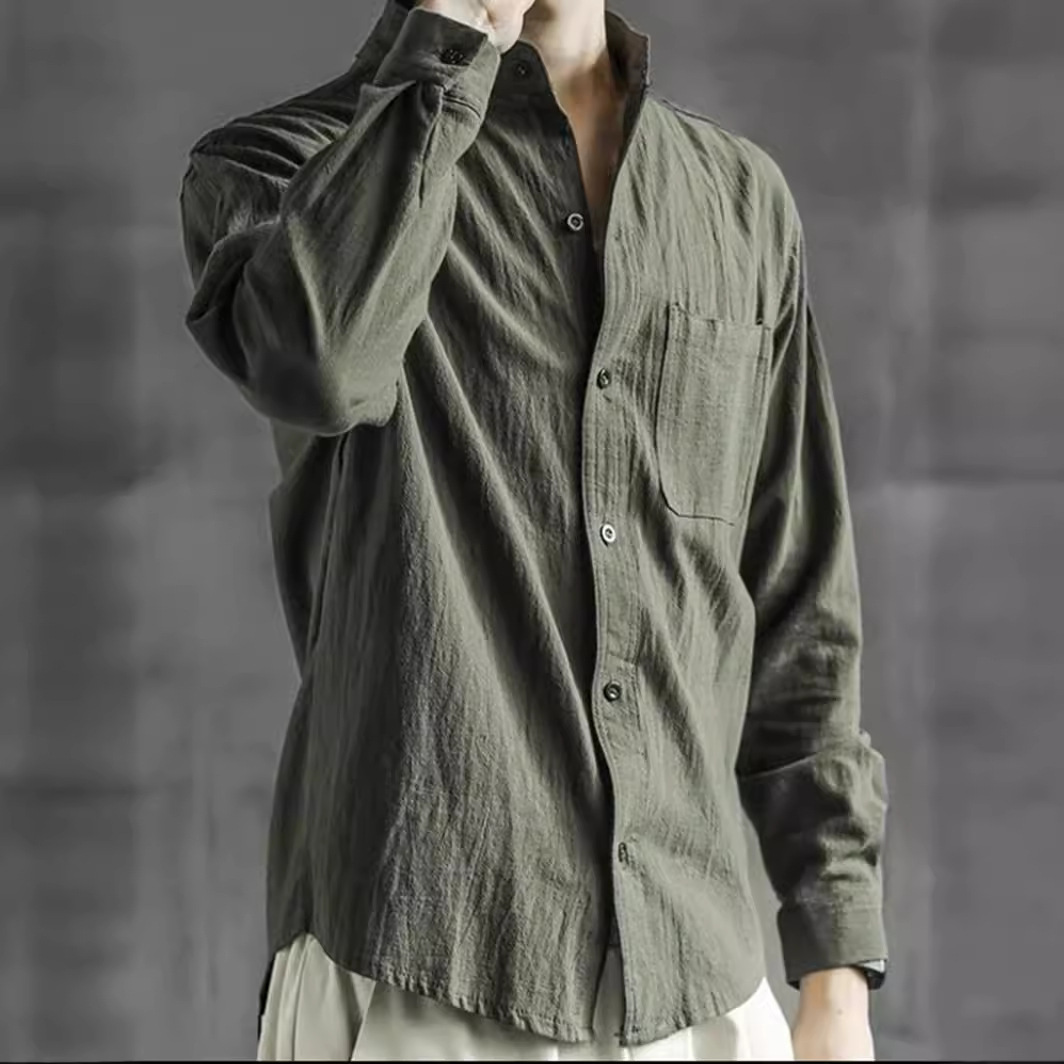 純色の七分袖のシャツの男性の春と秋の薄いタイプのカジュアルな寸のシャツの青年の立襟のゆったりしている綿の麻のシャツの男性