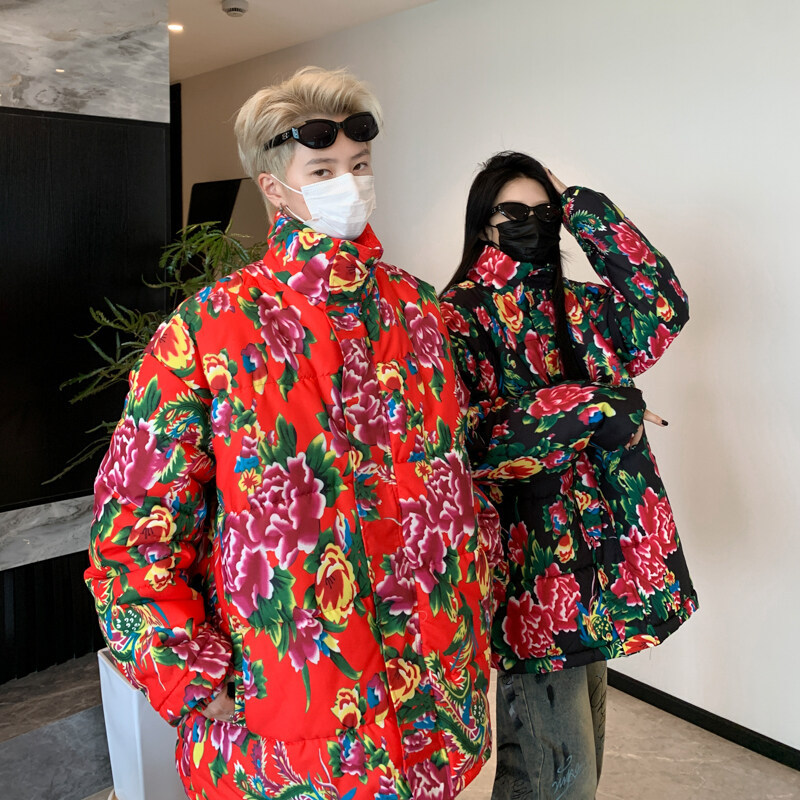 東北大花綿入れの男性モデルは冬に牡丹の花の綿服を厚くします。